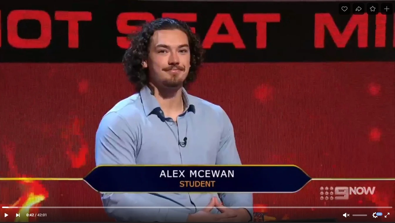 Alex Mcewan, was contestant, appeared on the 2023 season of Millionaire Hot Seat on September 25, 2023 and won AU$50,000.