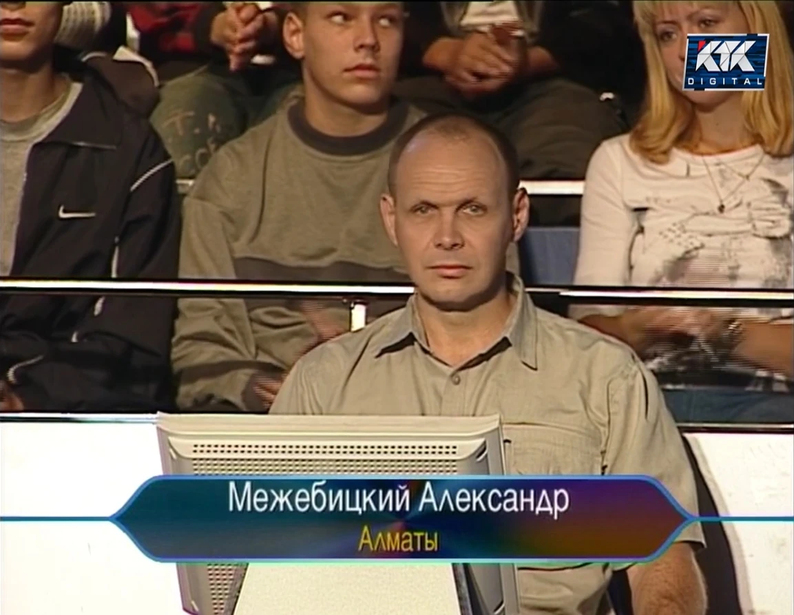 Alexander Mezhebitsky, from Almaty was a contestant on the second season of Kto vozmyot million?, on October 19, 2002. He won 300.000 tenge.