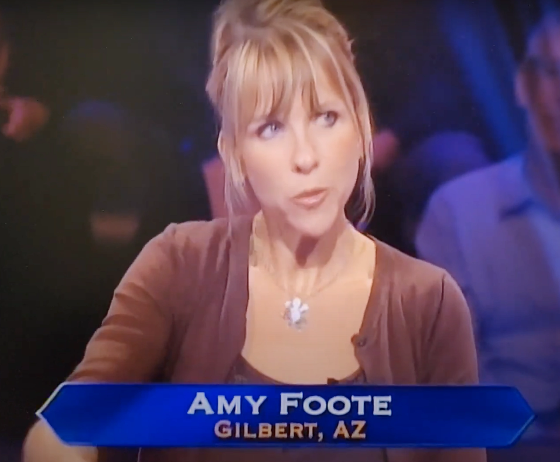 Amy Foote, from Gilbert, Arizona, appeared on Season 10 of the syndicated U.S. version of Who Wants to Be a Millionaire? during the Maytag Maxima Giveaway Week on October 17, 2011. She won $1,000.