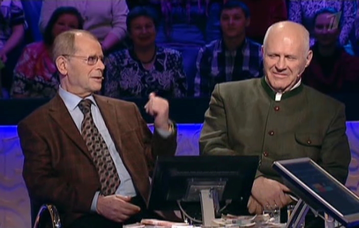 Arkady Arkanov (June 7, 1933 - March 22, 2015) and Anatoly Trushkin (October 28, 1941 - June 10, 2020) were celebrity contestants who appeared on episode of Kto khochet stat' millionerom? on July 16, 2011 answering to 7th question wrong and won 0 rubles.