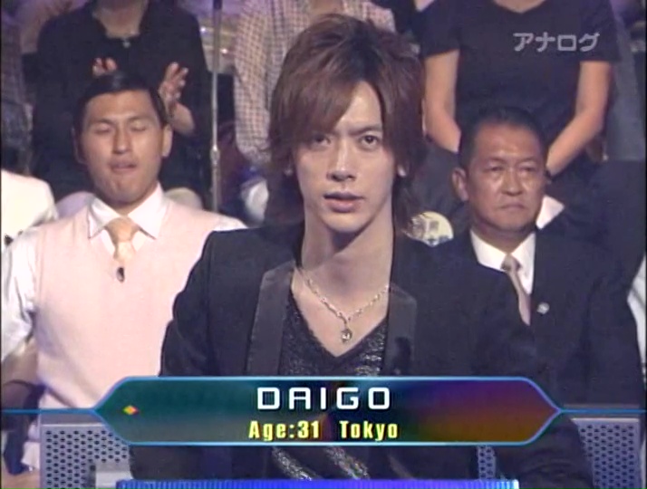 DAIGO (Japanese: ダイゴ) (April 8, 1978) was a celebrity contestant, who appeared on an special episode of Quiz $ Millionaire on September 15, 2009 and won ¥1,000,000 after missing his 14th question.