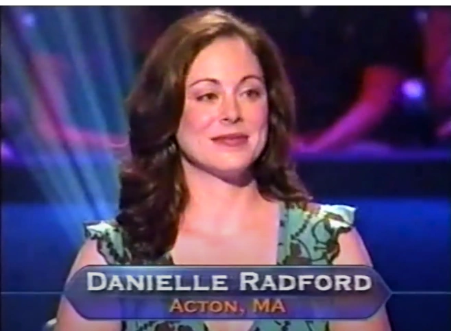 Danielle Radford, from Acton, MA, was a contestant who appeared on the 5th season of the syndicated U.S. version of Who Wants to Be a Millionaire? on September 19, 2006. She walked away with $1,000 after she answered her $16,000 question incorrectly.