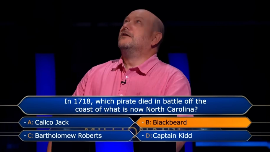Donald's £1,000,000 question asked which of four pirates died off the coast of modern North Carolina in 1718. He correctly answered "Blackbeard" upon remembering a history lesson he had taught 8 years before the show. Donald was congratulated by students at Haberdashers' Adams, who remembered Donald teaching them the lesson.