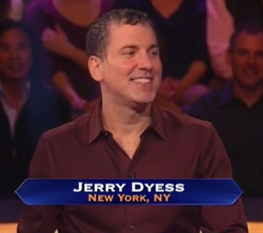 Jerry Dyess, from New York, NY, was a contestant who appeared on Season 9 of the U.S. version of Who Wants to Be a Millionaire? on May 13 & 16, 2011 and left with $1,000 after missing his eighth question.