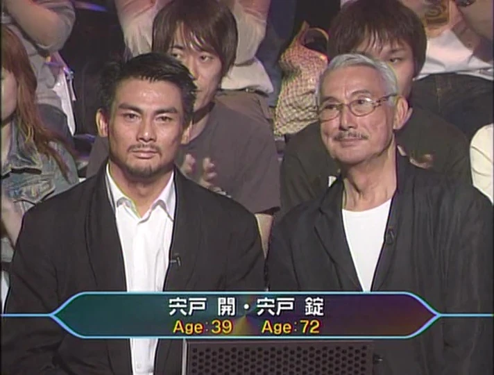 Joe Shishido (Japanese: 宍戸 錠) (December 6, 1933 - January 18, 2020) and Kai Shishido (Japanese: 宍戸 開) (September 4, 1966) were celebrity contestants who appeared on a Celebrity Parent and Child Special episode of Quiz $ Millionaire on May 25, 2006, and won ¥1,000,000.