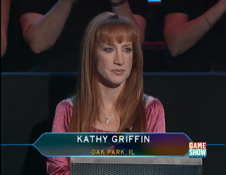 She later appeared on November 9, 2009 during the show's 8th syndicated season to ask a contestant the shows first ever Celebrity Question, worth $10,000. It was about another celebrity she has disputed having a "tragic life," noting that she's dated "every hot guy from Brad Pitt to John Mayer." The four choices were Drew Barrymore, Sandra Bullock, Jennifer Aniston and Renée Zellweger. The contestant immediately went for C: Jennifer Aniston and Kathy announced that he was correct.