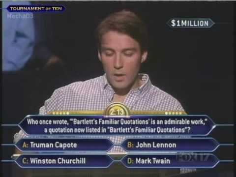 | As the game progressed, he first said that he knew the answer to the question, but it was later known that he was toying with Meredith, as a response to her "tricking" contestants in the Hot Seat. He had an inkling towards Winston Churchill (which was the correct answer) but decided to walk away because he wasn't even sure and because of the money at risk. The correct answer was C: Winston Churchill. $100,000 |