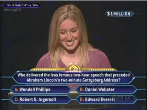 | Robin thought the answer was B: Daniel Webster, but decided not to risk half her winnings and walked away. Fortunately for her, the correct answer was D: Edward Everett. $50,000 |