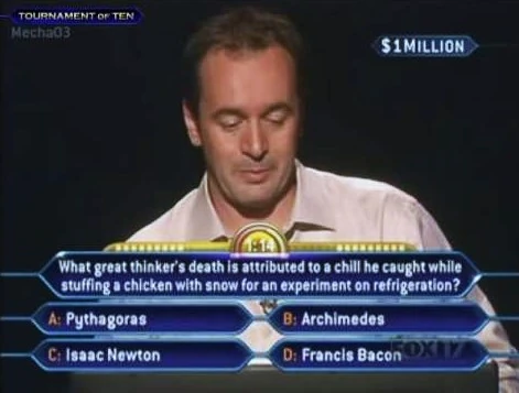 | What great thinker's death is attributed to a chill he caught while stuffing a chicken with snow for an experiment on refrigeration? | |