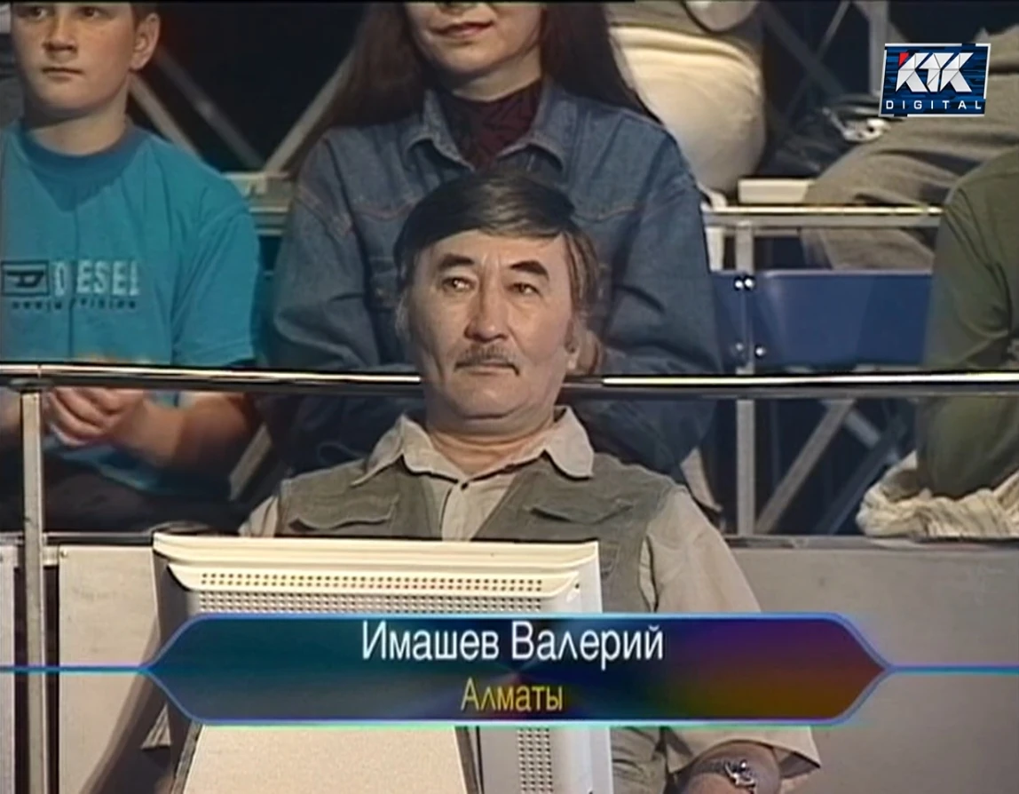 Valery Imashev, from Almaty was a contestant on the first season of Кто Возьмет Миллион?, on July 18, 2002. He won 80.000 tenge.