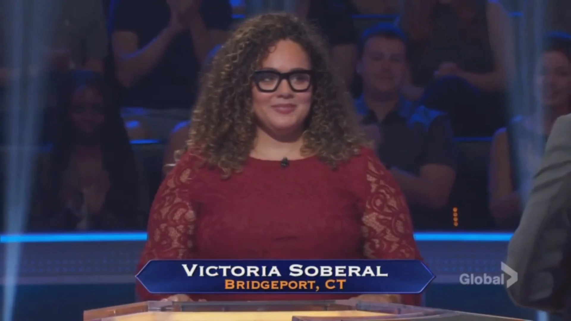 Victoria Soberal, a social media manager from Bridgeport, CT, was a contestant who appeared on the 16th season of the U.S. version of Who Wants to Be a Millionaire? on September 25, 2017 and won $5,000 after answering her $10,000 question wrong.