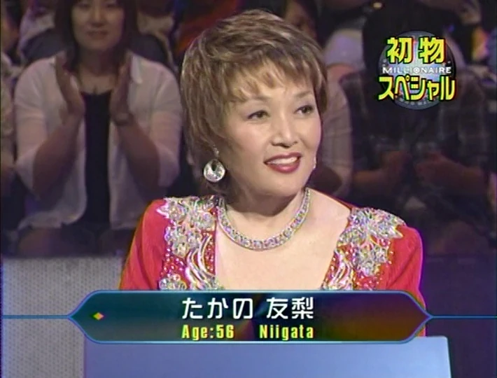 Yuri Takano (たかの友梨/髙野 友梨, Takano Yuri, born 22 January 1948), was a celebrity contestant, who appeared on an episode of Quiz $ Millionaire on September 30, 2004, answered the Top Prize question wrong and won ¥1,000,000.